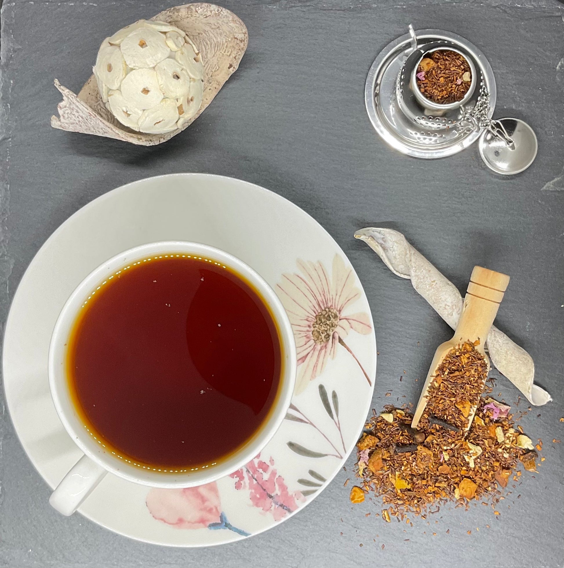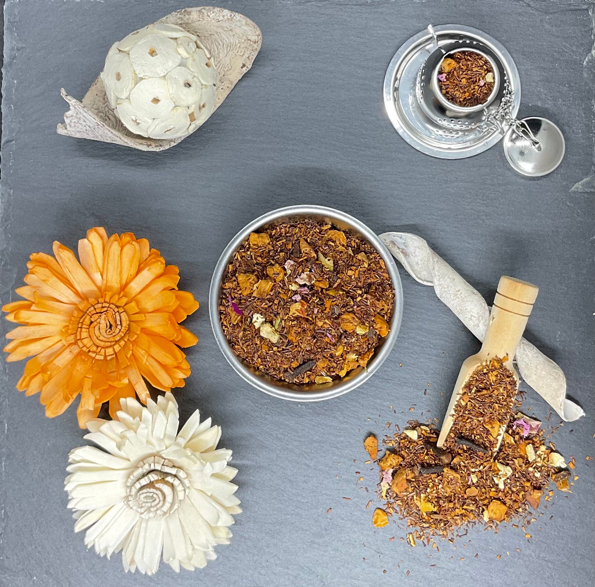 Ingrédients: Rooibos naturel*, pomme*, écorces d'orange*, bâtons de cannelle*, arôme naturel d'orange, clou de girofle*, arôme naturel de cannelle, pétales de rose*, cardamome*. *Issu de l‘agriculture biologique