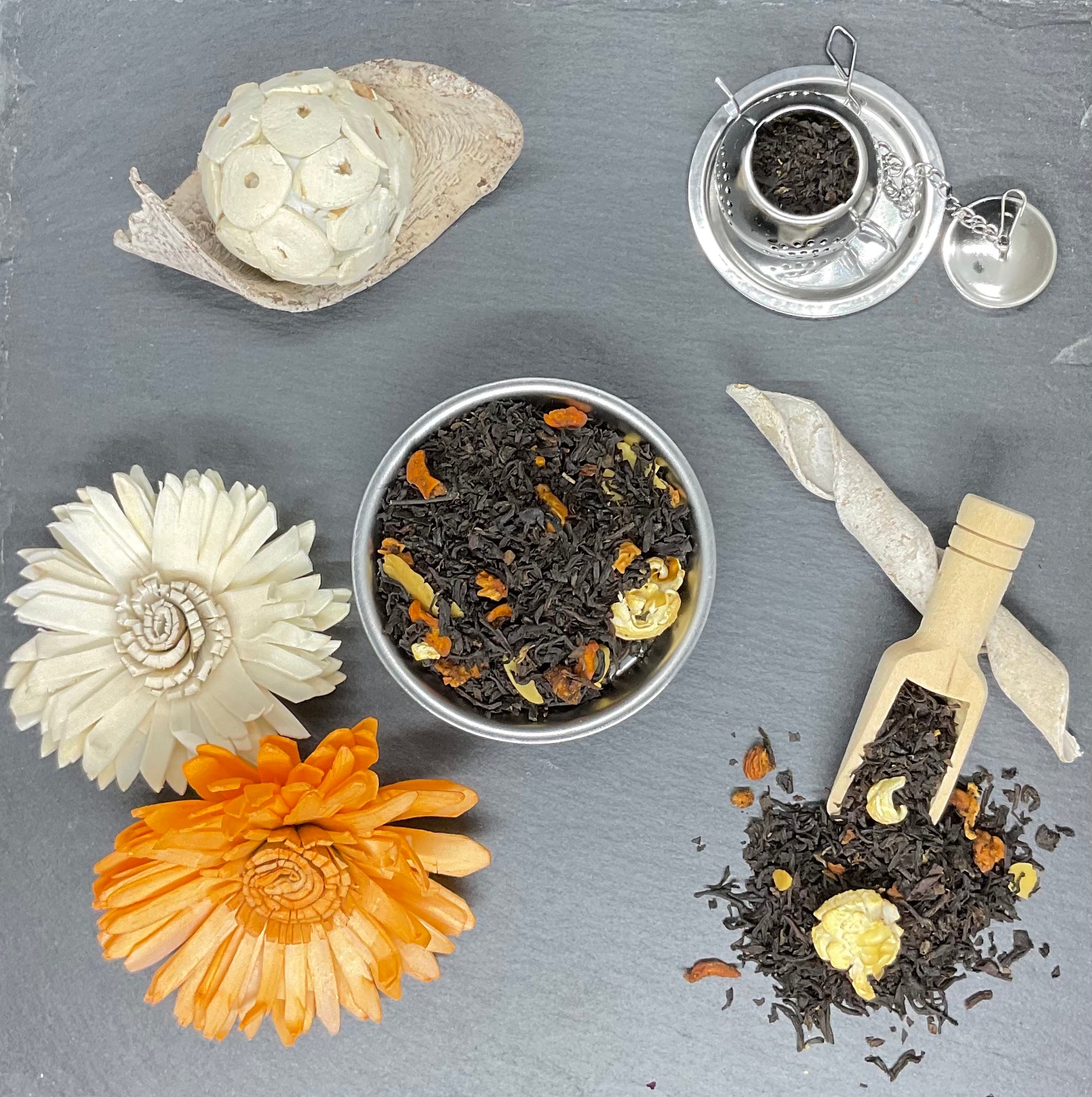 Ingrédients: Thé noir Ceylan, -Inde du Sud, -Chine, citrouille, pomme, arôme, pomme, pop-corn, AMANDE, CARAMEL (SUCRE, SIROP DE GLUCOSE, BEURRE, CRÈME, EAU), cannelle écrasée.